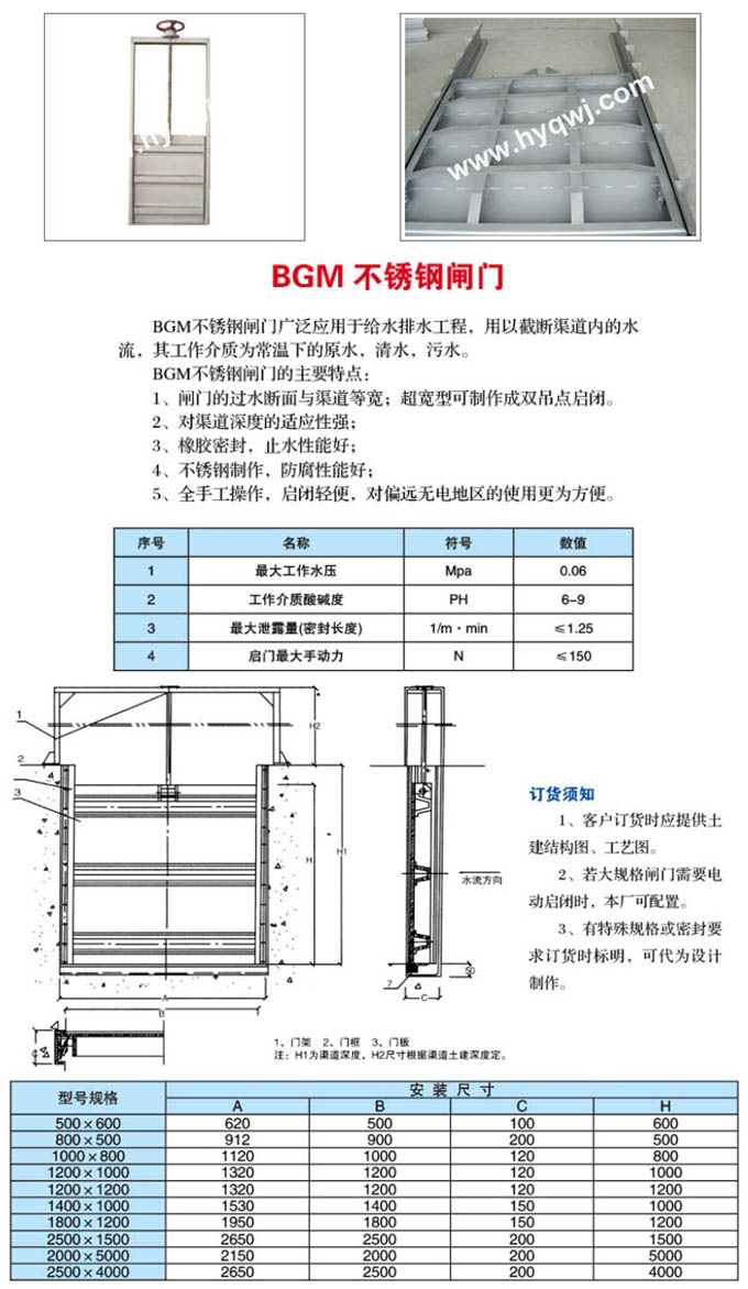 BGM不銹鋼閘門廣泛應(yīng)用于給排水工程,用以截?cái)嗲纼?nèi)的水流,其工作介質(zhì)為常溫下的原水、清水、污水。