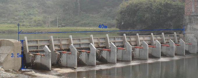 自動翻板壩,洪水漫頂20cm后,便自動翻板,河道行洪順通,對保護農(nóng)田將起到很大作用.